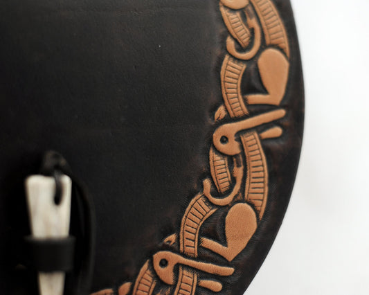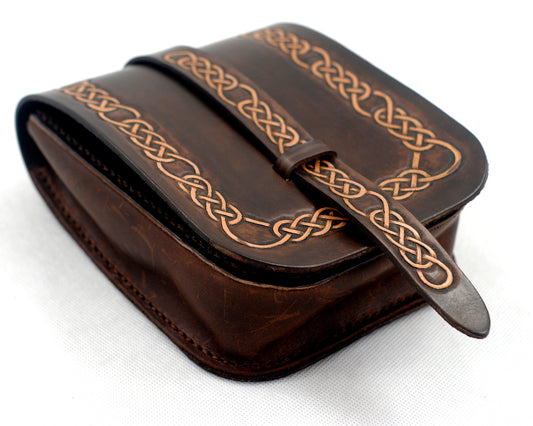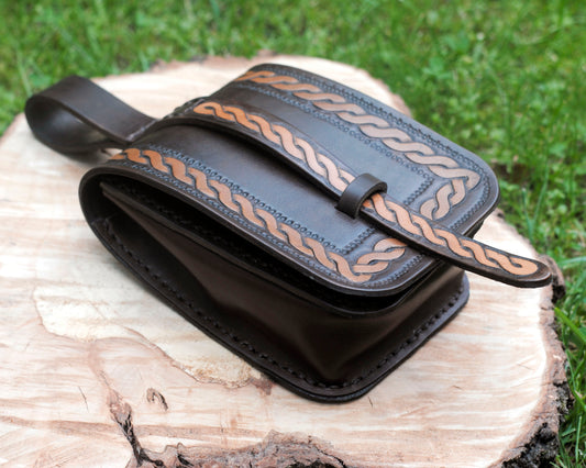 Sakiewki skórzane mocowane na pasku. Ręcznie tłoczone na mokro oraz malowane.