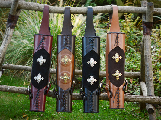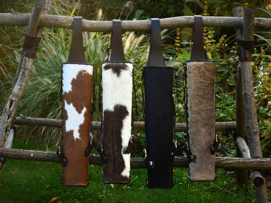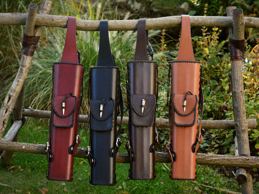 Auf dem Rücken getragene Köcher. Der Querschnitt des Köchers ist elliptisch, der flache Teil liegt auf der Rückseite.