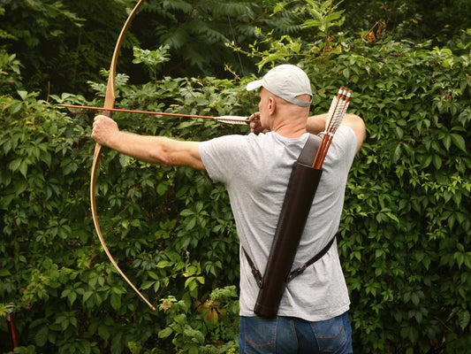 Köcher mit starrer Struktur und halbkreisförmigem Querschnitt, die auf dem Rücken getragen werden.